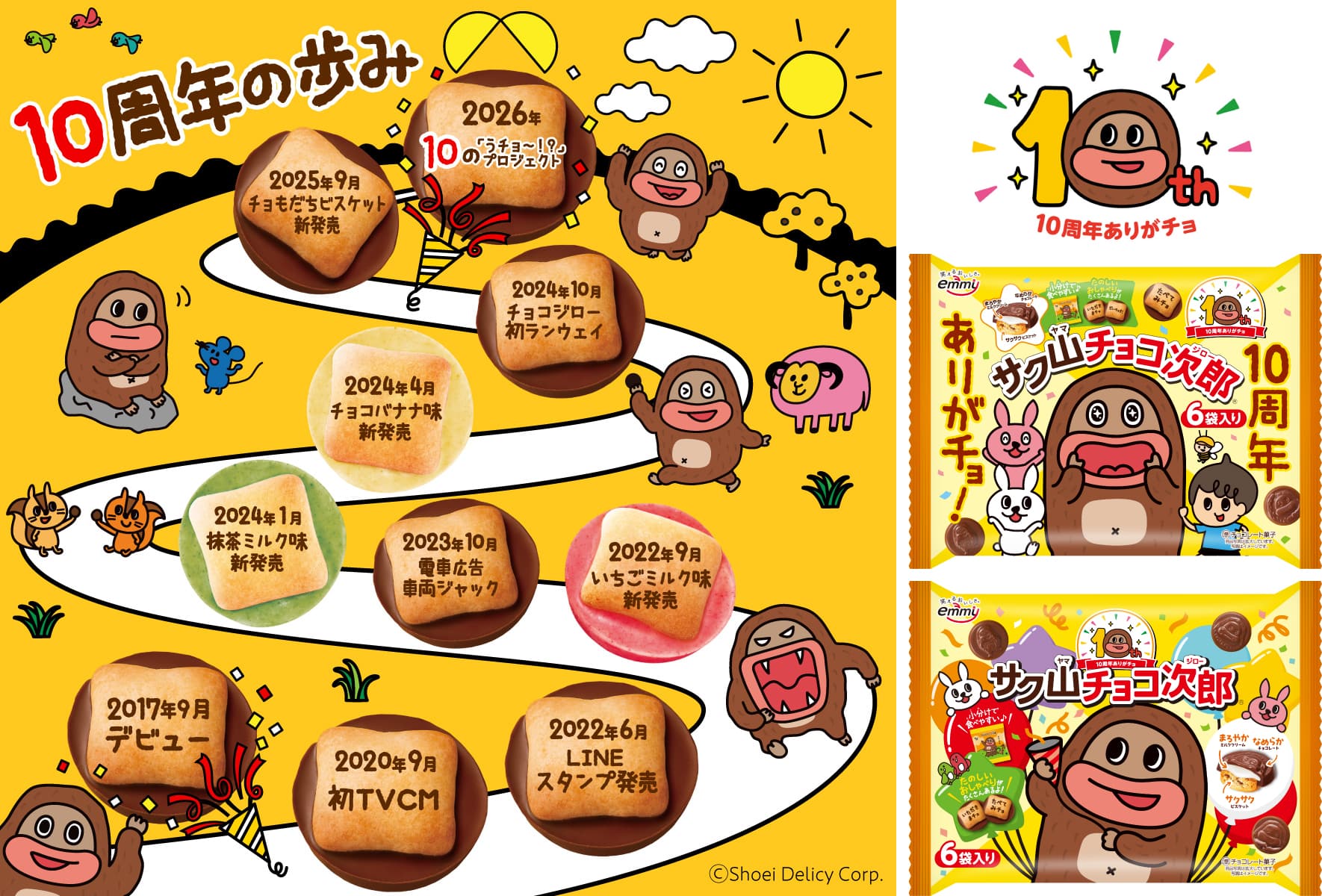 10周年を迎える2026年をさらなる飛躍の年にするべく、10の「うチョ~!?」プロジェクトを始動いたしました。MyMとのコラボをはじめ、サク山チョコ次郎シリーズファンの皆さまに喜んでいただける企画を引き続き実施予定です。