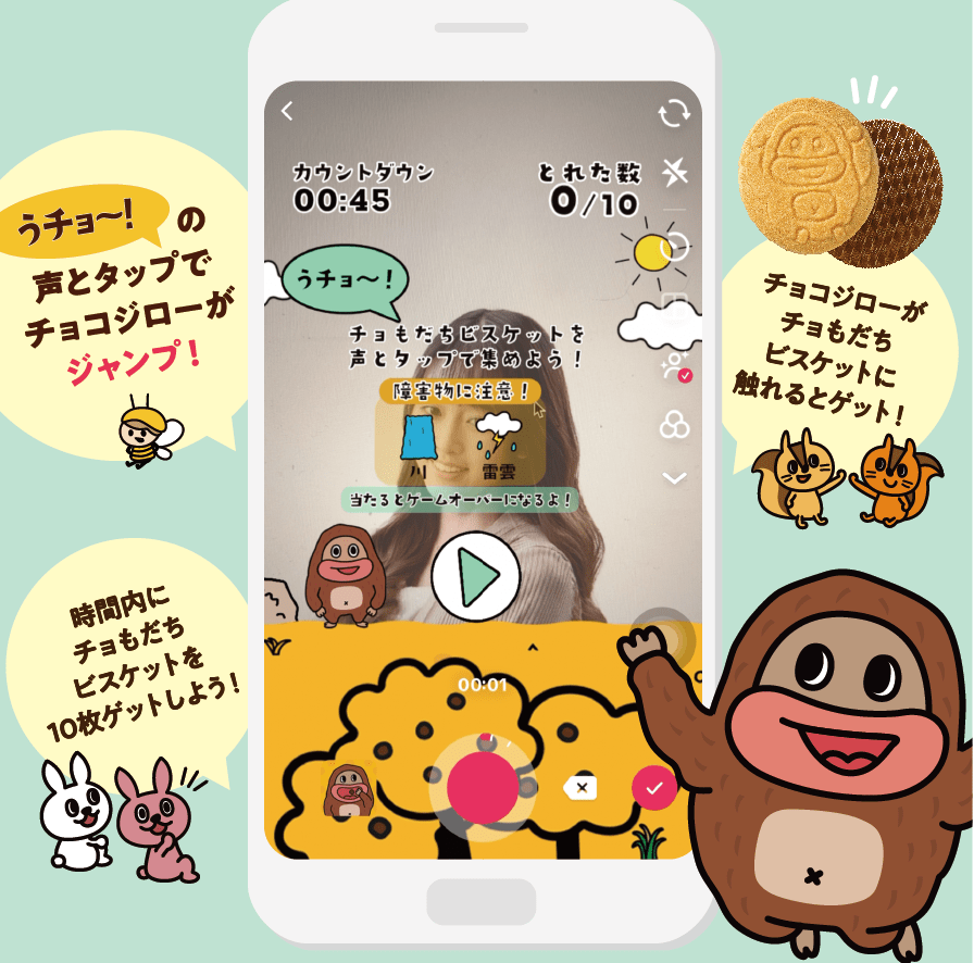 声かタップでチョコジローを操作して、チョもだちビスケットをゲットしよう!